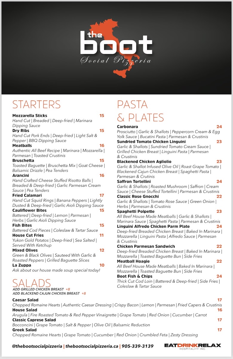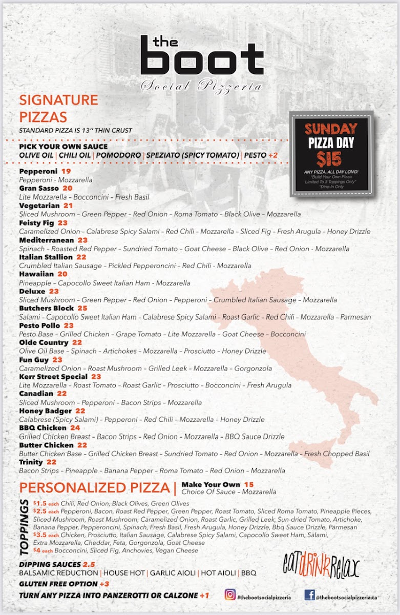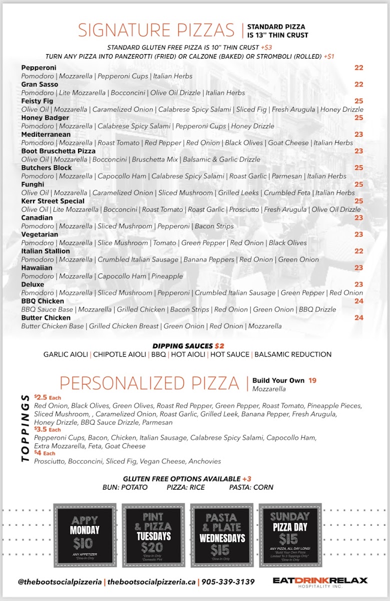 Welcome to The Boot Social Pizzeria, where authentic Italian flavors thrive in a lively atmosphere. Located at 579 Kerr St, Oakville, this pizzeria is the perfect spot for pizza lovers and pasta enthusiasts alike. The menu features a selection of mouthwatering dishes, including their famed Hawaiian pizza, known for its crispy thin crust and fresh toppings. Customers rave about the rich and creamy carbonara, highlighting the quality ingredients used in every dish.
